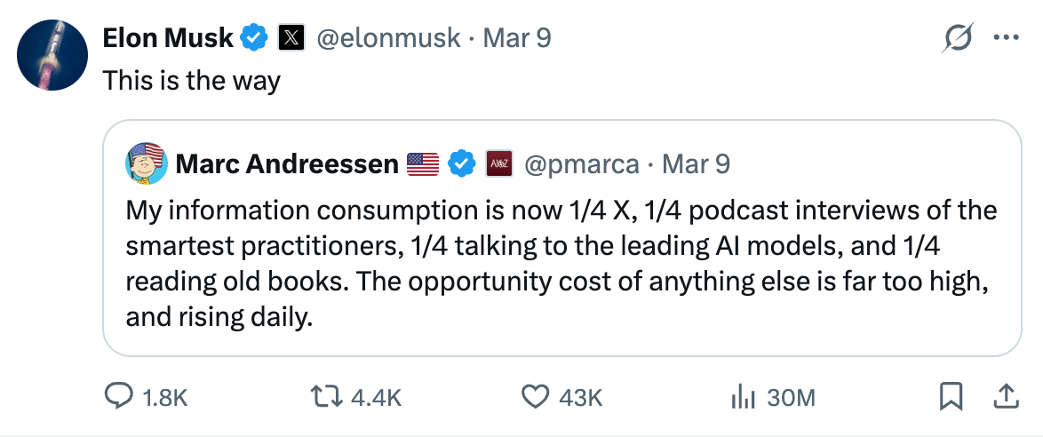 Andreessen said his information consumption is now split into quarters: one-quarter X, one-quarter podcast interviews with the smartest practitioners, one-quarter conversations with leading AI models, and one-quarter reading old books.